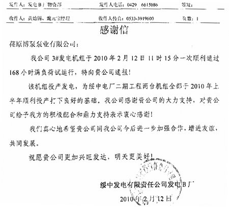 日前,綏中發(fā)電有限責(zé)任公司發(fā)電B廠發(fā)來(lái)感謝信,通報(bào)了我公司供貨的2000VZNM型立式循環(huán)水泵順利通過(guò)168小時(shí)滿負(fù)荷試運(yùn)行, 順利發(fā)電。綏中發(fā)電有限責(zé)任公司發(fā)電B廠,為2X1000MW超